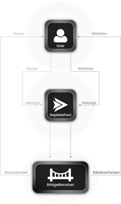 In order for user to be able to earn across all chains, Replete utilizes a supply architecture where the protocol logic, liquidity and accounting is hosted on one chain. To chain abstract the supply process, Replete utilizes a combination of messaging, interoperable token standards (such as OFT's) and bridges to maintain unified liquidity on a host chain.